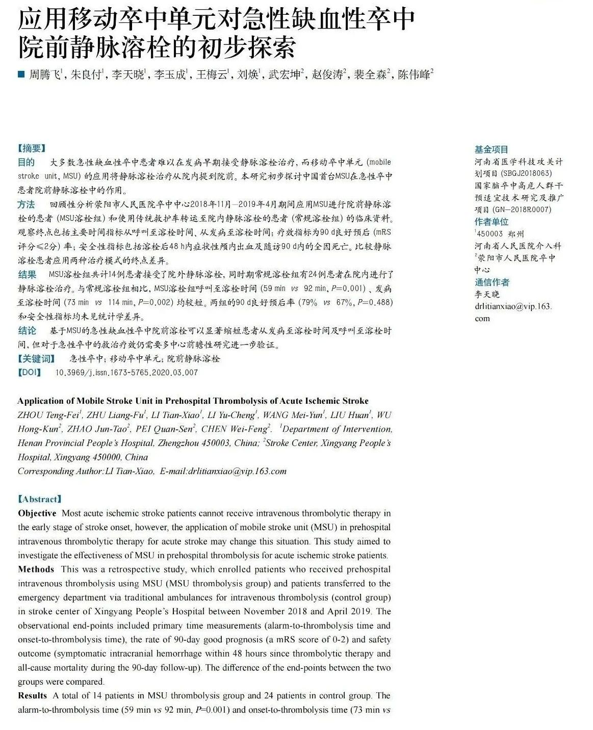 摩科特論文集│應用移動(dòng)卒中單元對急性缺血性卒中院前靜脈溶栓的初步探索